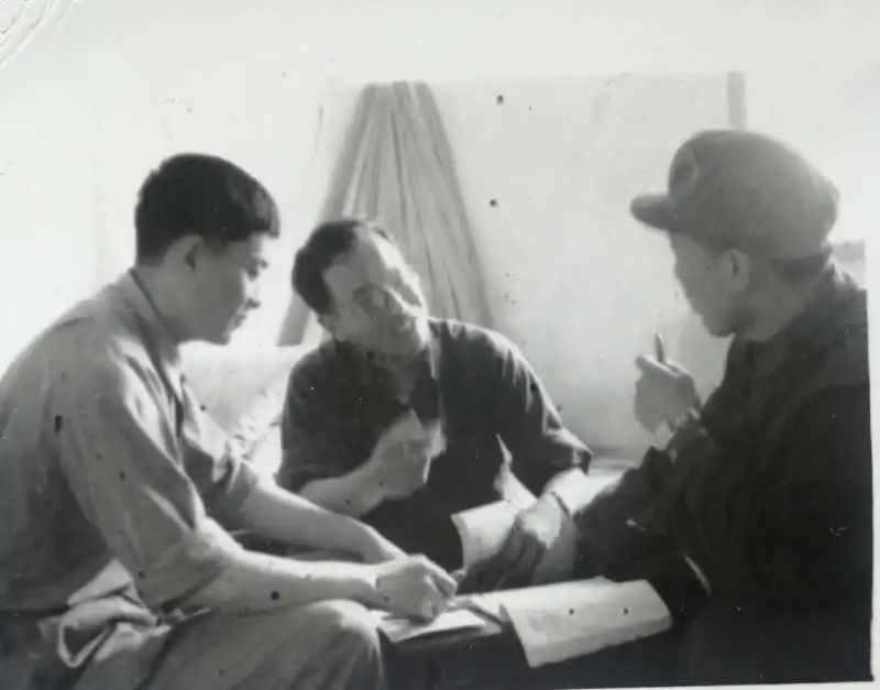 开门办学时,与青年工人一起学哲学。着军装的是徐立贵。